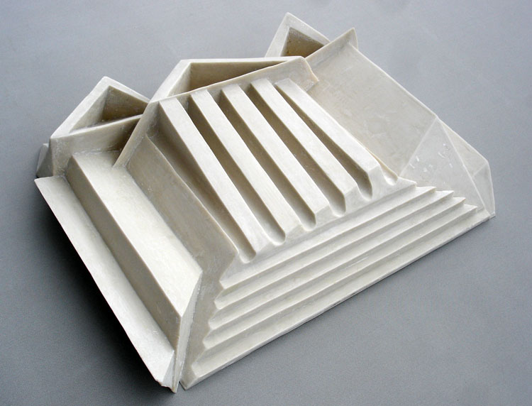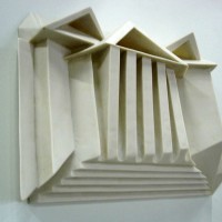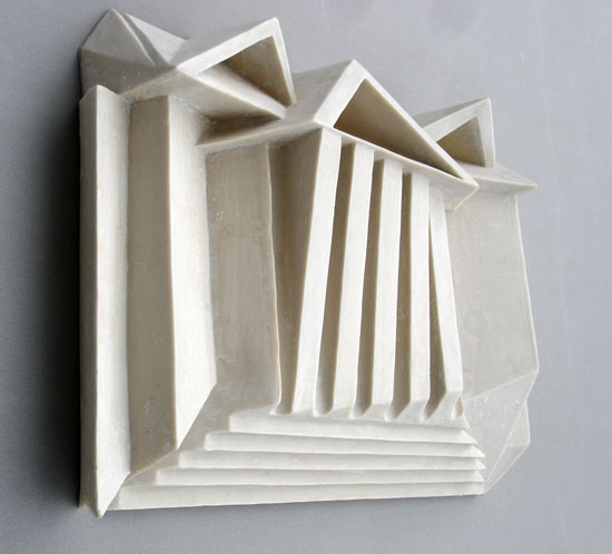Descrição: Releitura da arquitetura da Universidade Federal do Paraná em Curitiba. Executada em marmorite, laminada com fibra de vidro. Obra de parede.