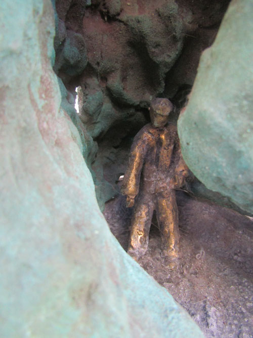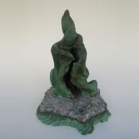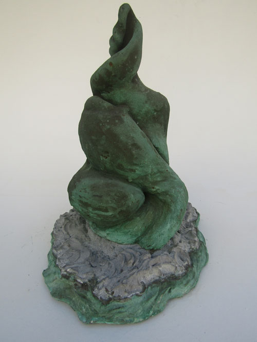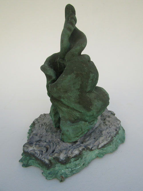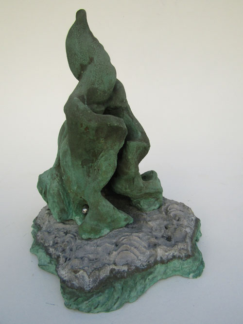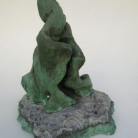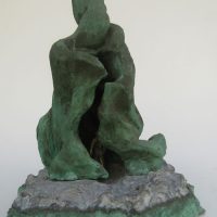 Escultura em resina e alumínio. Apresenta revestimento externo de bronze com pátina quente verde. Em seu interior repousa uma figura masculina em bronze e em seu exterior uma esfera de aço incrustada.