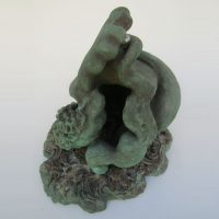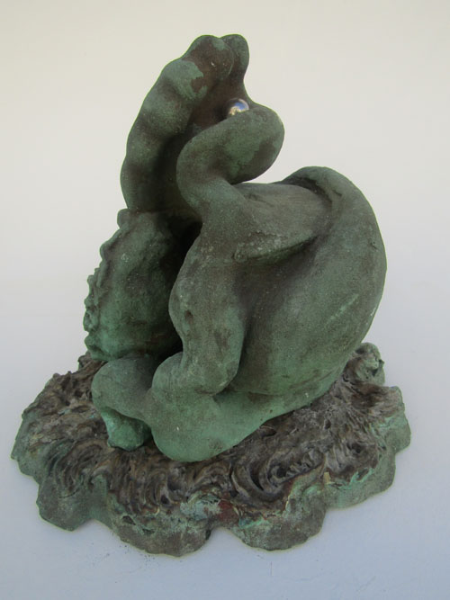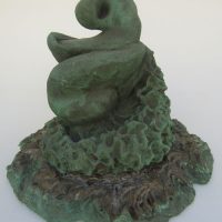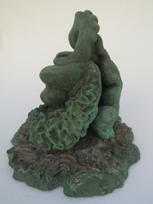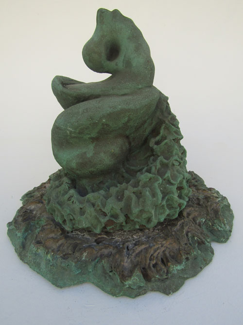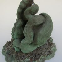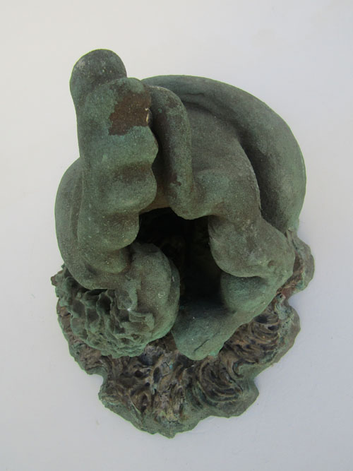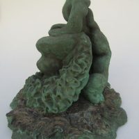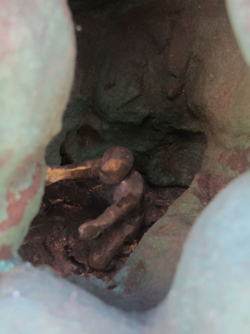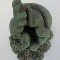 Escultura em resina e bronze. Apresenta revestimento externo de bronze com pátina quente verde. Em seu interior repousa uma figura masculina em bronze e em seu exterior uma esfera de aço incrustada.