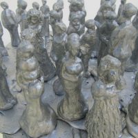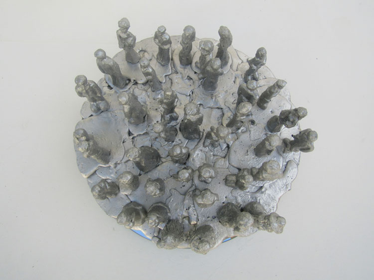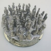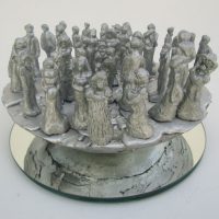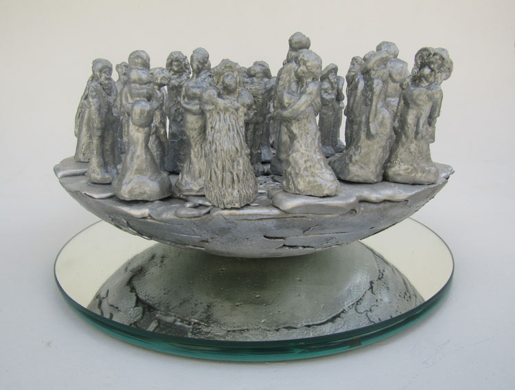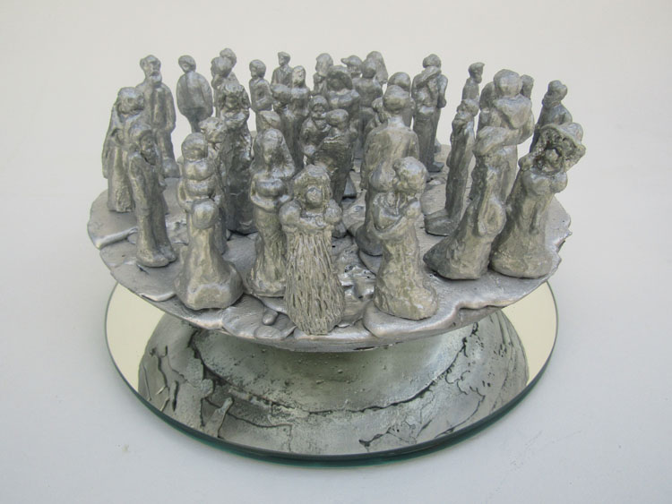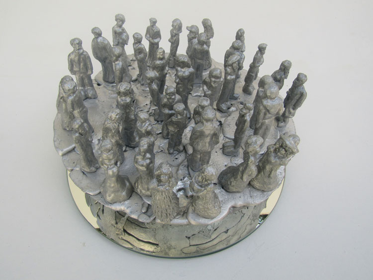 Obra não fixada, repousando sobre o espelho, apenas em equilíbrio, rodando suavemente sobre seu eixo ao simples toque. As pequenas figuras são exclusivas, modeladas uma a uma e estão em equilíbrio sobre o topo da esfera. Como as figuras estão soltas, ficam propensas a queda pela movimentação da base, o que acarreta permanente rearranjo do tabuleiro.