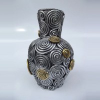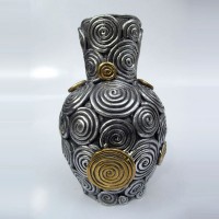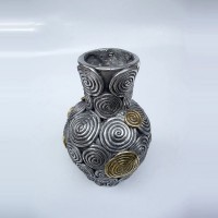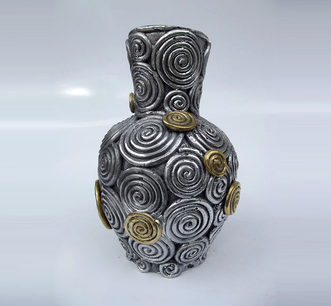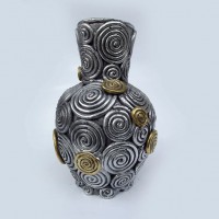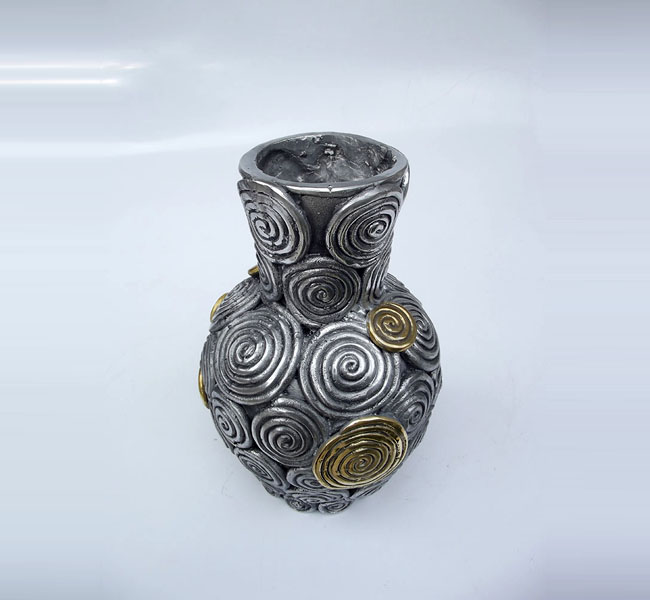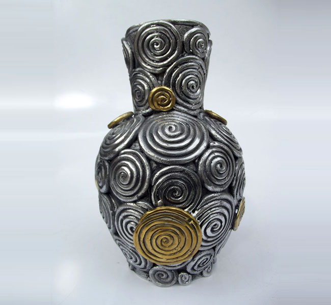 Descrição: Vaso acordelado de alumínio polido, com apliques em bronze. Motivo arabesco.
